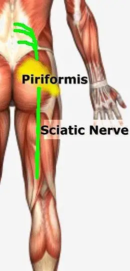 3. Buttocks... The third location where pressure can be put on the sciatic nerve is in the buttocks. There are many muscles located there and the sciatic nerve passes underneath these muscles- at least they are supposed to. In some unlucky people, the sciatic nerve passes through a muscle called the piriformis muscle causing the so called “piriformis syndrome”. So, if it contracts into spasm, it can actually pinch or ‘scissor’ the sciatic nerve irritating it. Simple actions such as pressing on the gas pedal while driving can cause this muscle to contract, thereby pressing on the sciatic nerve.